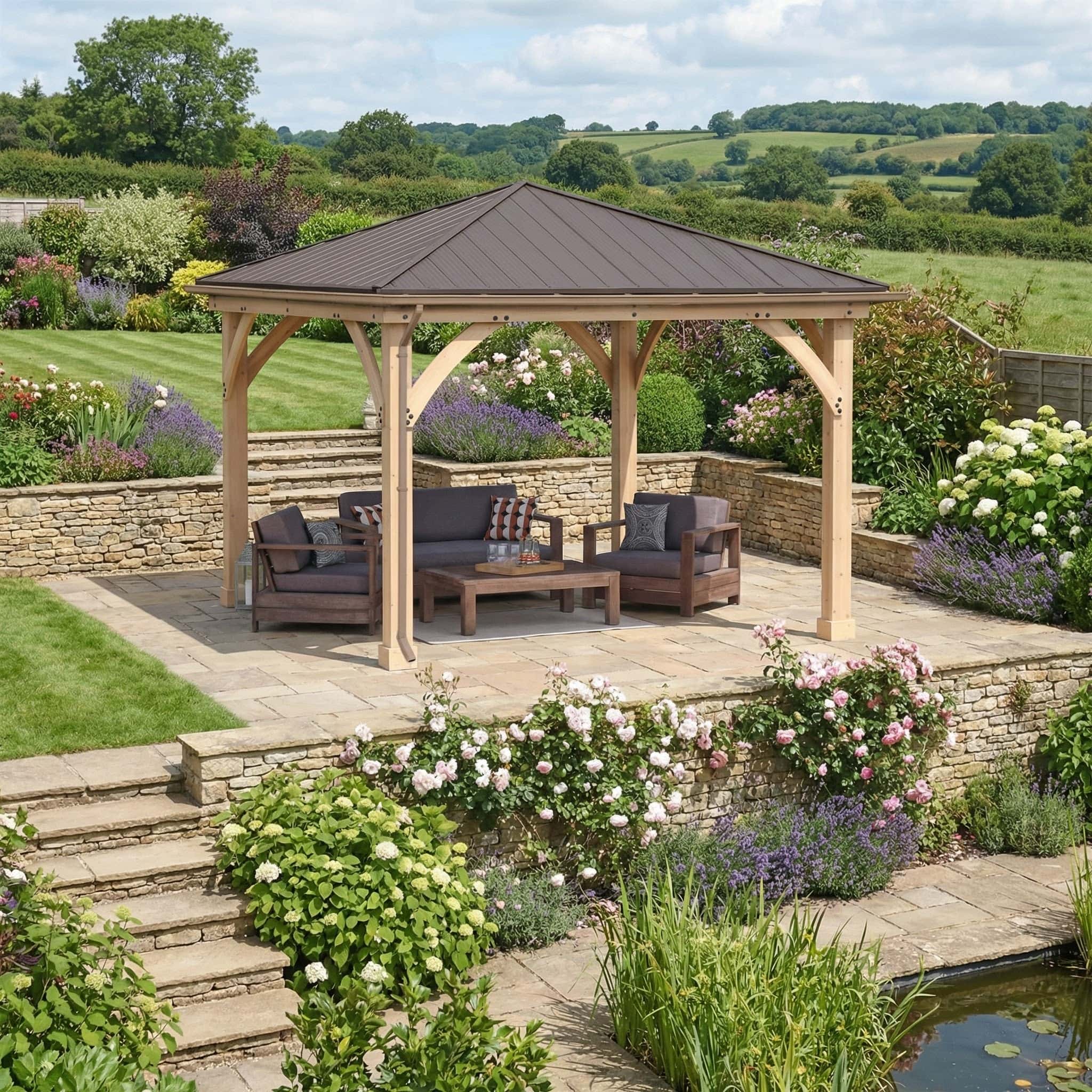 Transform your garden into a year-round retreat with the Yardistry Meridian Series Wooden Gazebo. Choosing a Wooden Gazebo with Rain Guttering ensures you stay comfortable and dry whatever the weather. Measuring 12ft x 12ft (3.7m x 3.7m), this premium cedar structure offers generous space for hosting, relaxing, or sheltering your hot tub. Not only does it elevate your outdoor lifestyle, but it also adds lasting value and visual appeal. Indeed, a Wooden Gazebo with Rain Guttering is the ideal solution for British gardens.