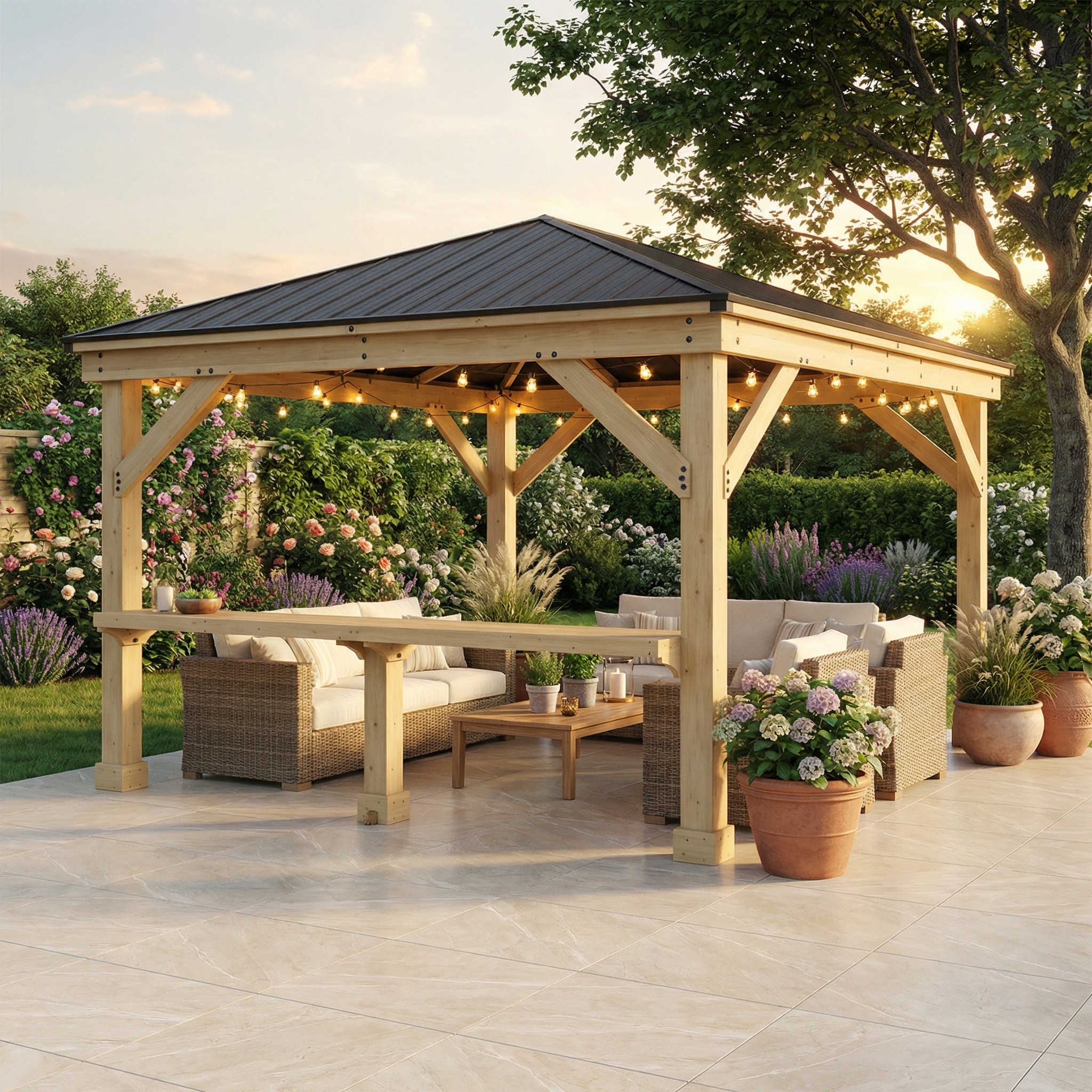 • Expansive 12ft x 16ft Footprint Large enough for dining sets, lounge furniture, hot tubs, or multi‑zone entertaining layouts.