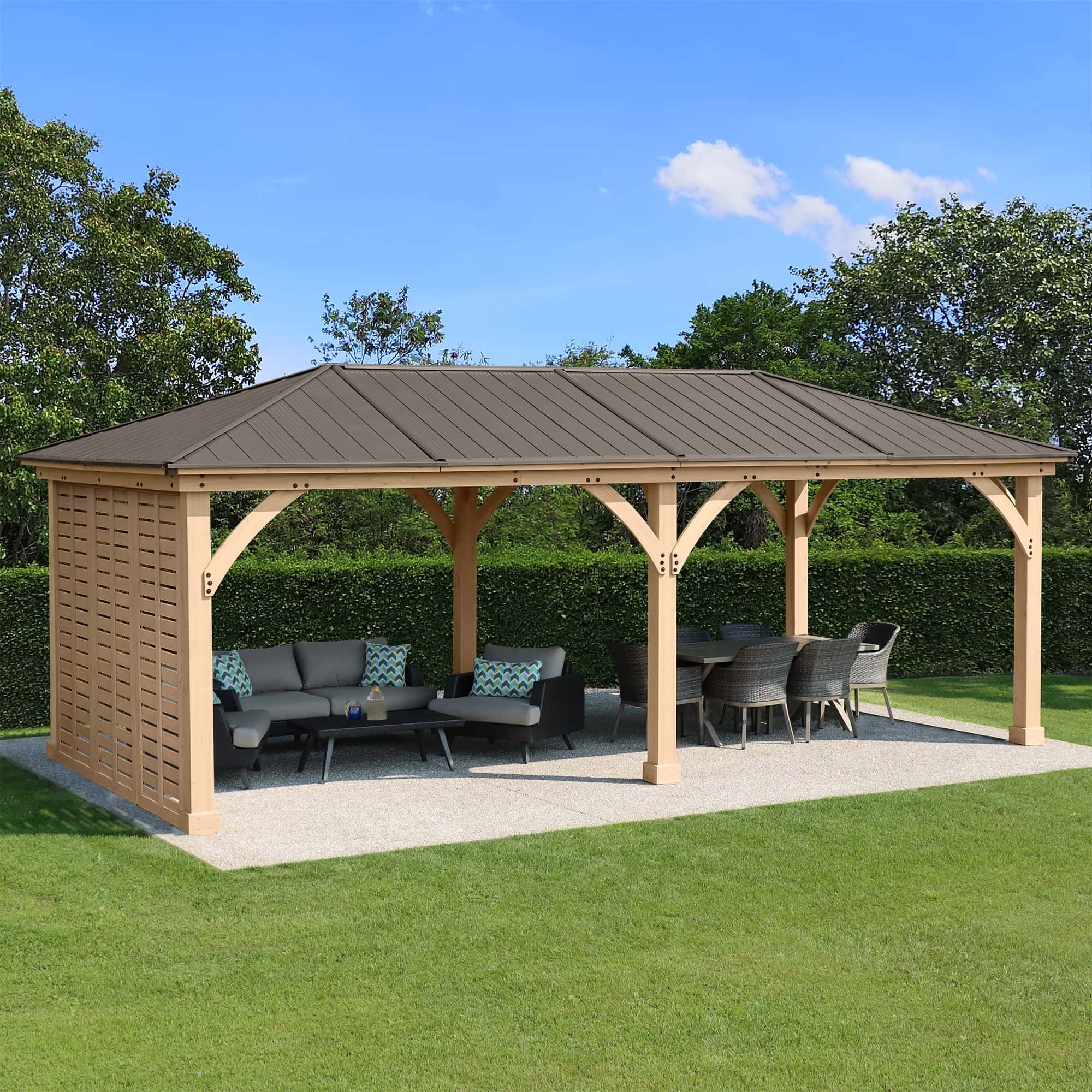 Expand your outdoor living space with the Yardistry Wooden Gazebo 12ft x 20ft (3.7m x 6.2m) with Wall & Wooden Shelf. This is the perfect structure for your garden, including a generous sidebar in a colour-matched natural cedar stain. The Yardistry Wooden Gazebo 12ft x 20ft (3.7m x 6.2m) with Wall & Wooden Shelf adds character to any area. Therefore, creating the perfect setting for outdoor entertainment. The stunning design features an Aluminium Roof with 6” x 6” Posts, plus heavy corner gussets. Finally, the 100% Cedar Lumber is finished with a beautiful natural cedar stain colour that brings a warm and distinctive feel to any space.