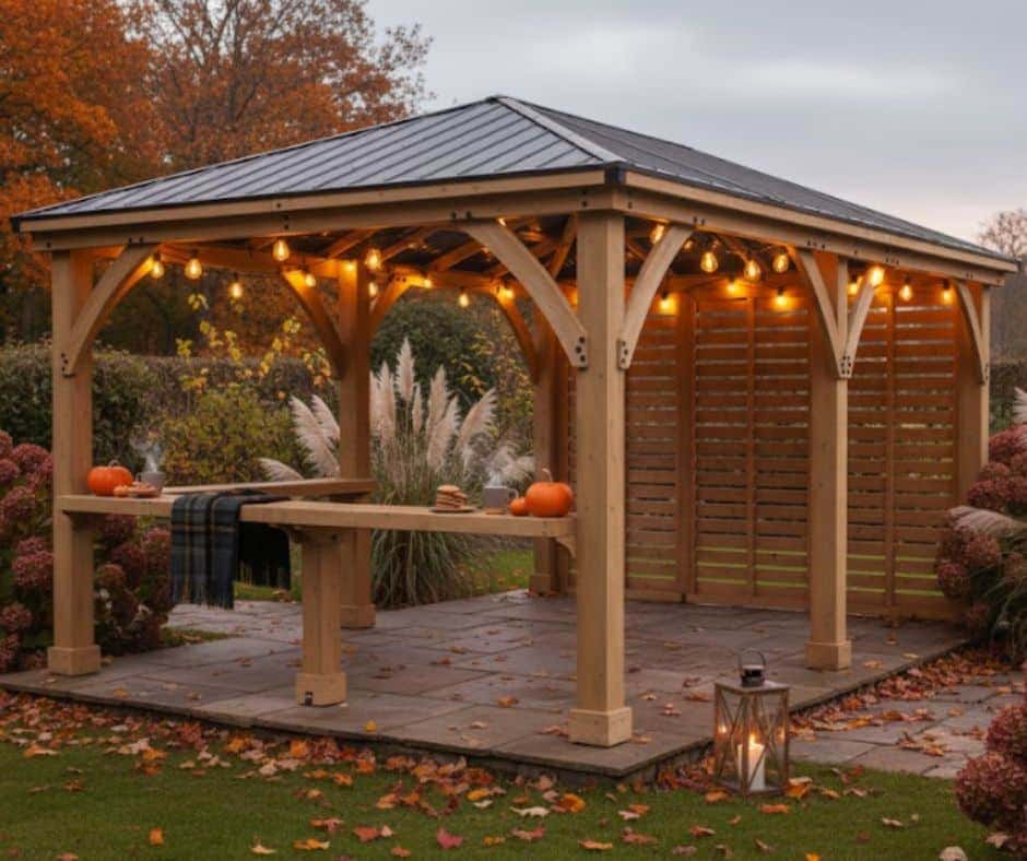 Cedar has many advantages for use in outdoor structures like this gazebo. It doesn’t swell, warp or decay and is naturally resistant to insects. Overall, it is naturally beautiful. It is made of 100% premium exterior-grade cedar and coated in an environmentally friendly natural cedar colour stain.