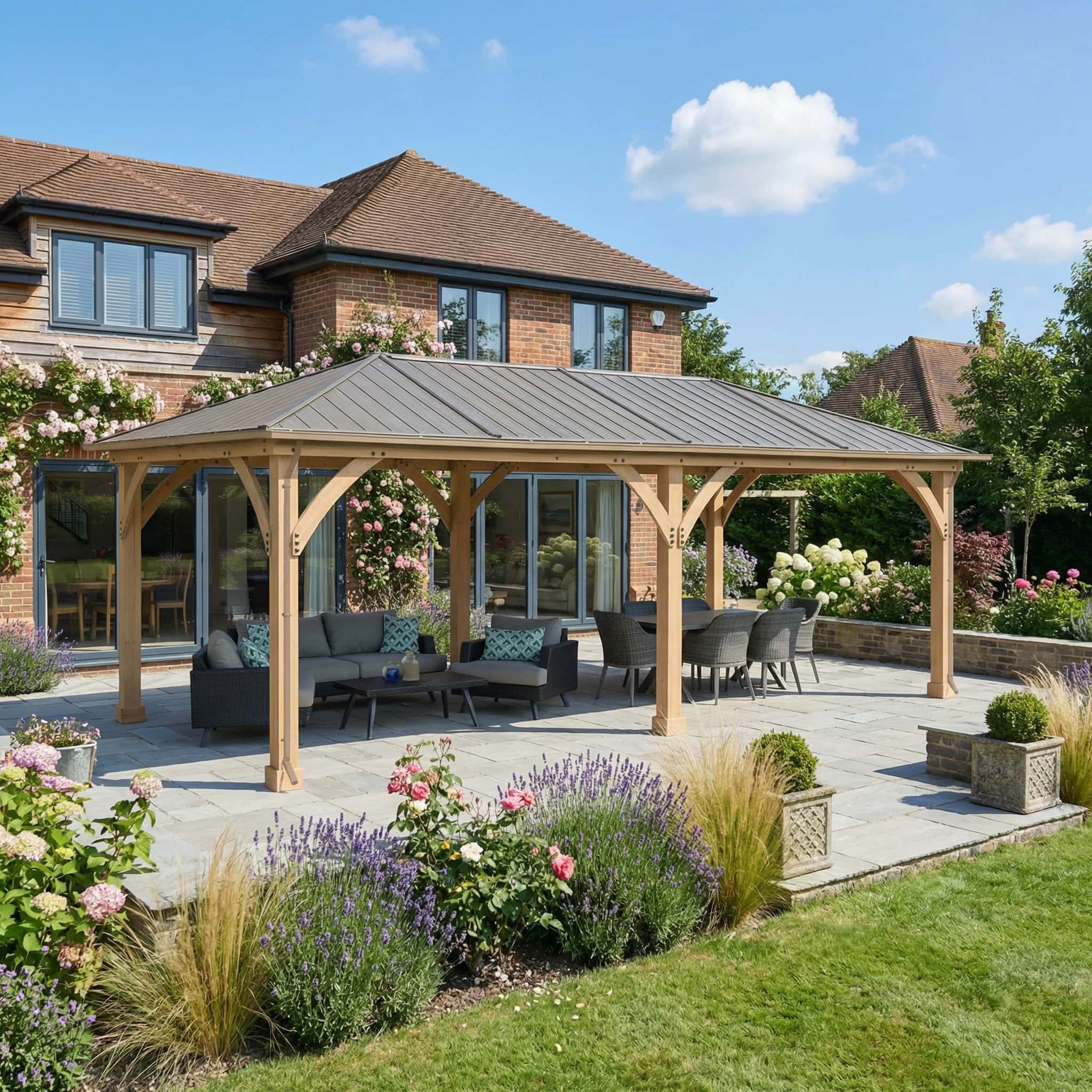 The integrated guttering system makes it especially practical for the UK climate, ensuring the area beneath stays dry and comfortable even during wet weather.