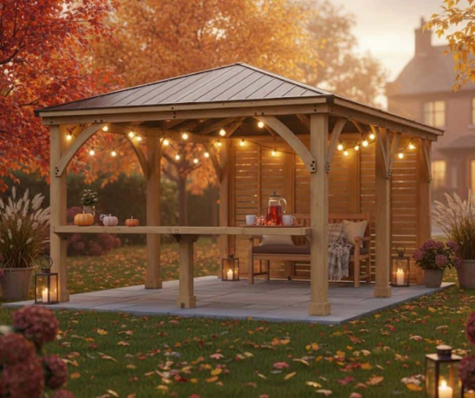 Cedar has many advantages for use in outdoor structures like this gazebo. It doesn’t swell, warp or decay and is naturally resistant to insects. Overall, it is naturally beautiful. It is made of 100% premium exterior grade cedar and coated in an environmentally friendly natural cedar colour stain.