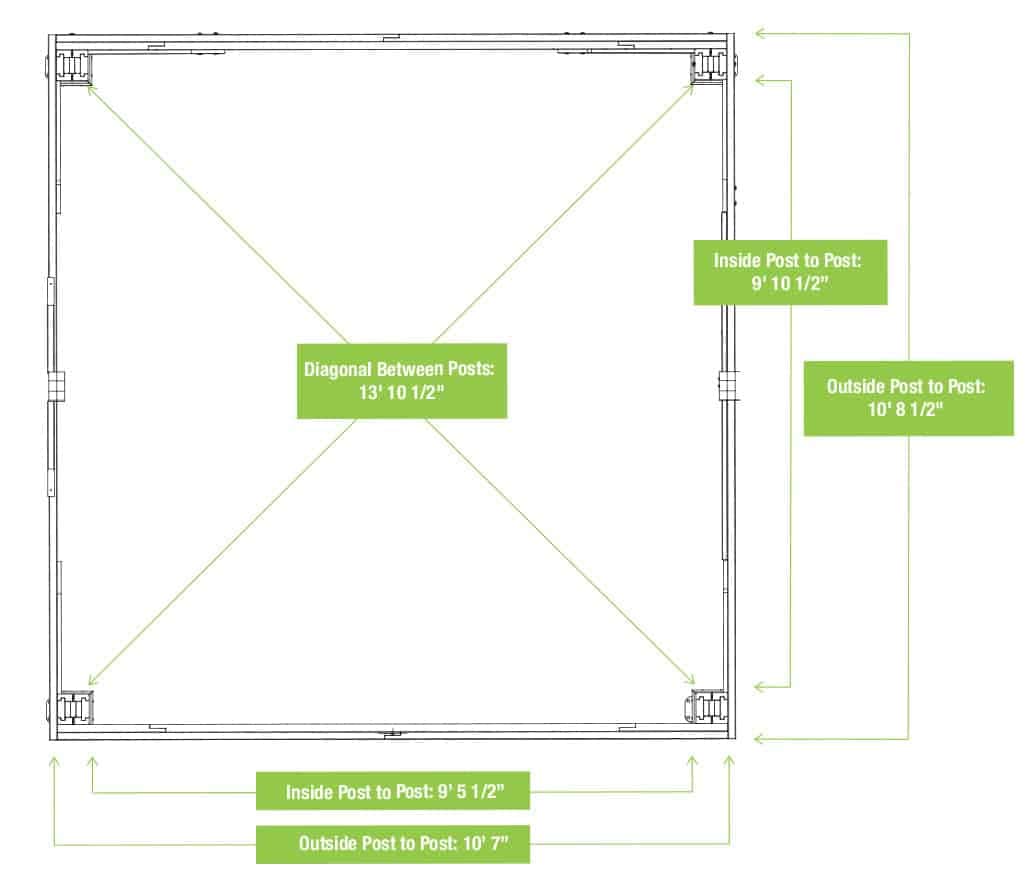 - Base Dimensions (outside of posts): 11’ L x 10’ 7” W