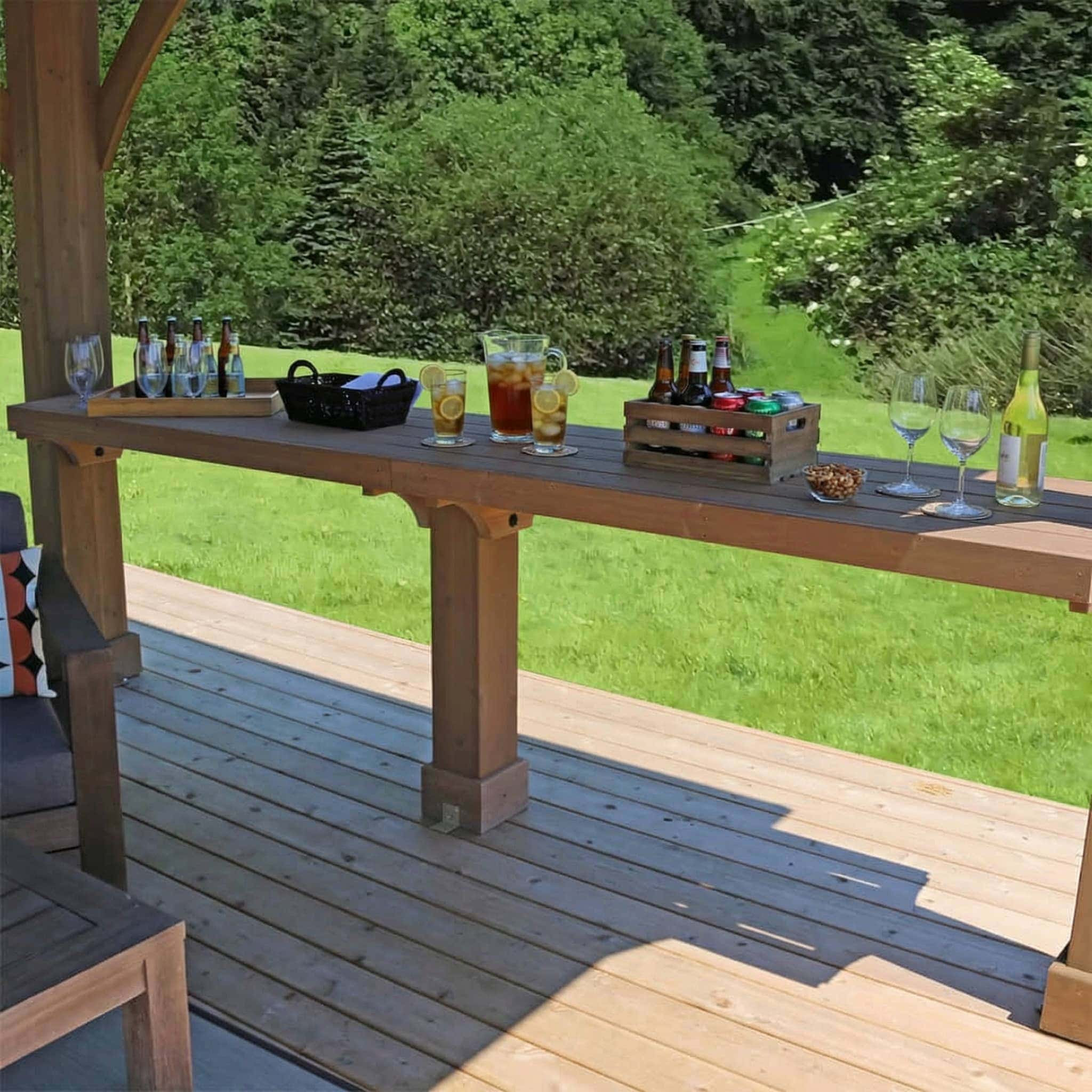 Yardistrydirect’s 12ft Gazebo Wood Counter is the perfect addition to your existing 12 x 12, 12 x 14, 12 x 16, 12 x 20, 12 x 24 Wood Gazebo with Aluminium Roof. This item is also suitable for the Grand Gazebo by Yardistry. The 100% Cedar Lumber is finished in our Mocha brown stain to match your existing Yardistry Direct Gazebo. Offering high-quality wood protection, and weatherproofing. Minimising the damaging effects caused by weathering, such as cracks and splinters. Therefore bringing a warm and distinctive feel to your garden. Measuring 9ft 8 inches wide and 37 3/4 inches tall, the 12ft Gazebo Wood Counter is designed to easily fit into the opening on the 12ft Wall of Costco Gazebos. Overall it complements the setup perfectly.