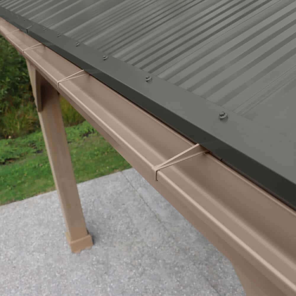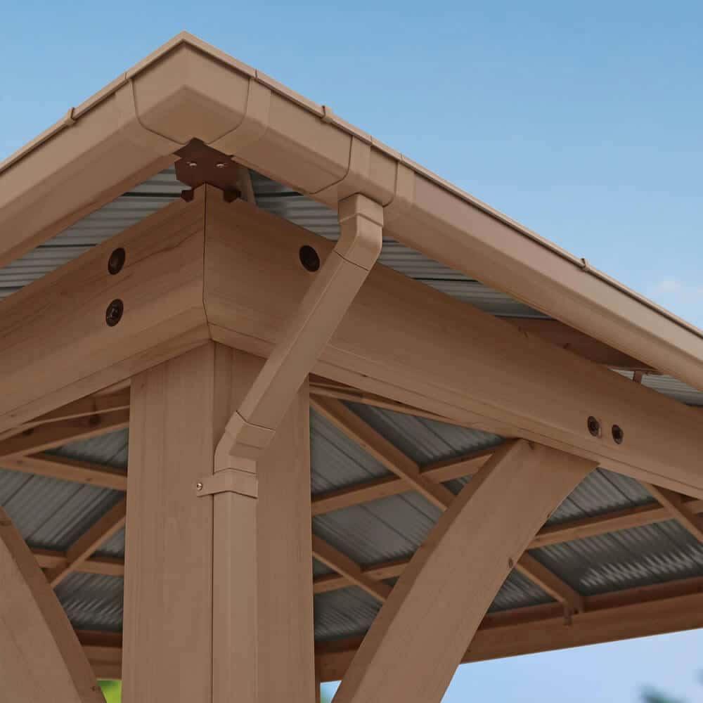 - Gutter and downspouts are made with PVC and are coloured matched to compliment the mocha brown wood stain colour of Yardisty Gazebos