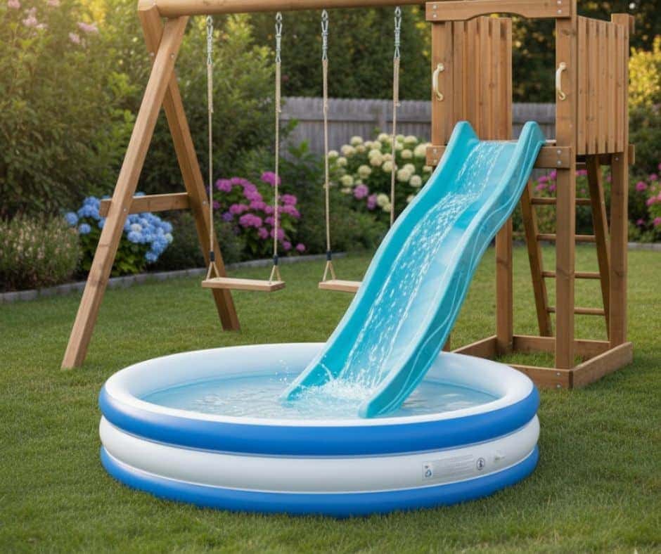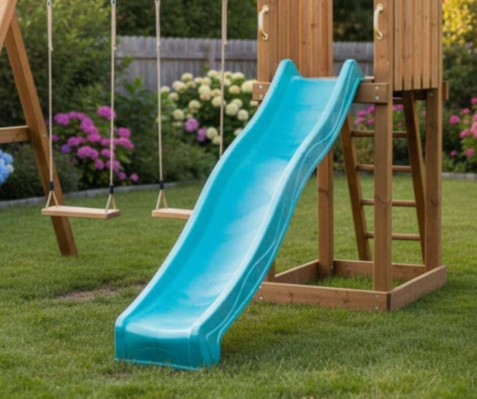 FUN FACT – This slide can also be used as a waterslide! Perfect for those long summer days. This is easily facilitated by connecting a hosepipe to the attachment on the back side. You will find this at the top of the slide.