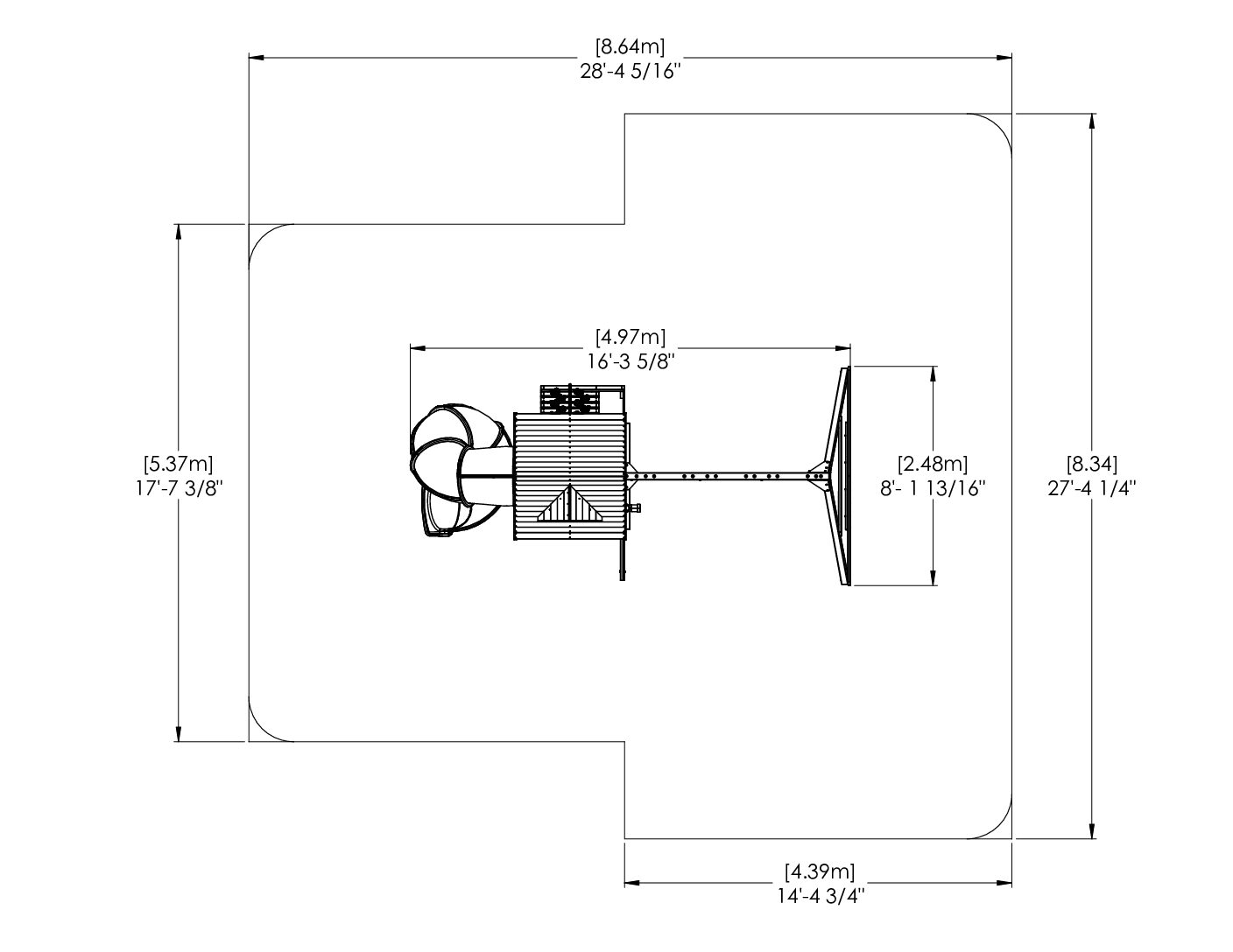 - Overall playset dimensions: 16 ft 3 5/8 in (4.97 m) L x 8 ft 1 3/16 in (2.48 m) W x 10 ft 1/2 in (3.06 m) H