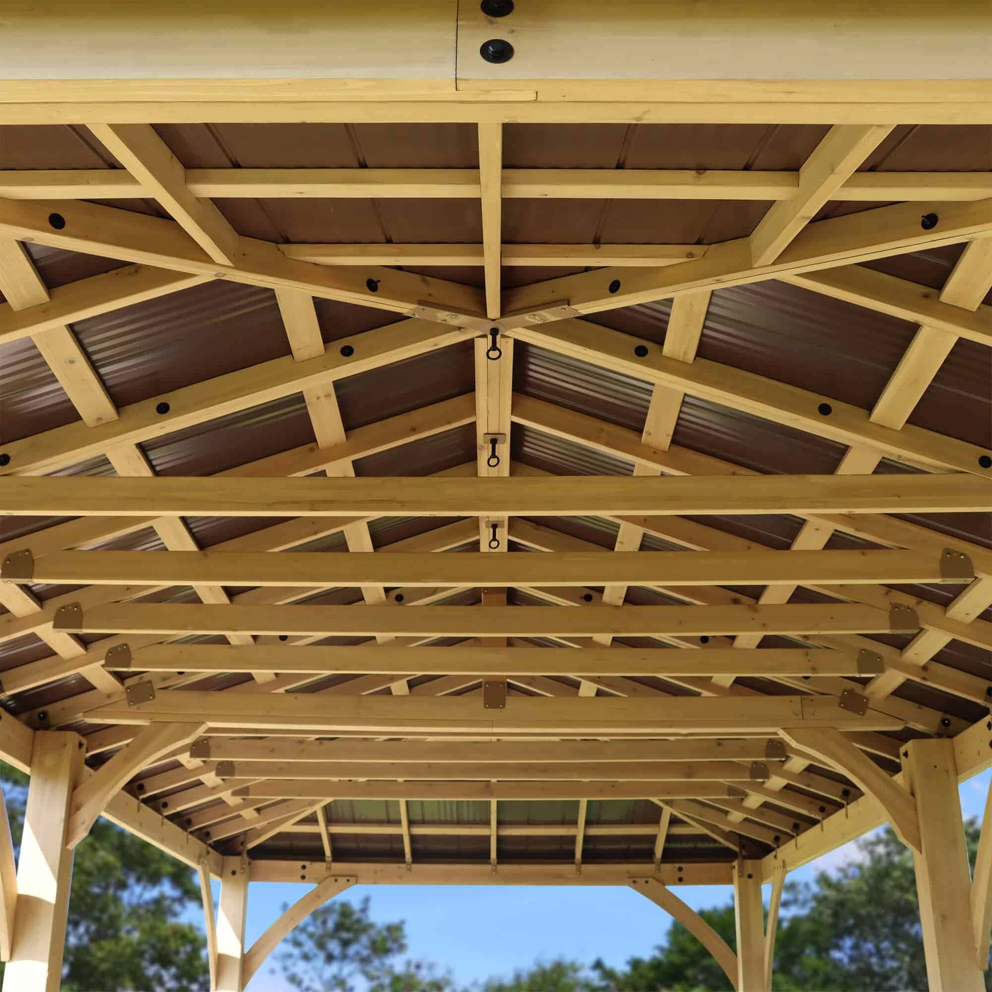 - Double beam roof support with 2 steel beam inserts, cedar roof straps and rafters and 8 cedar roof ties