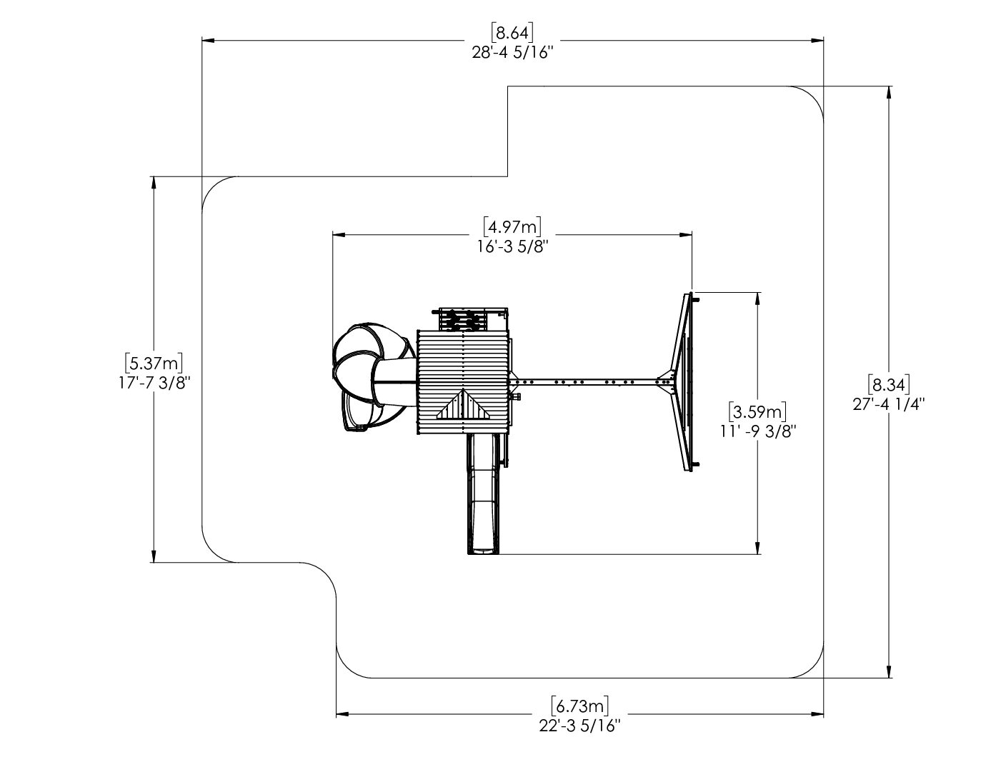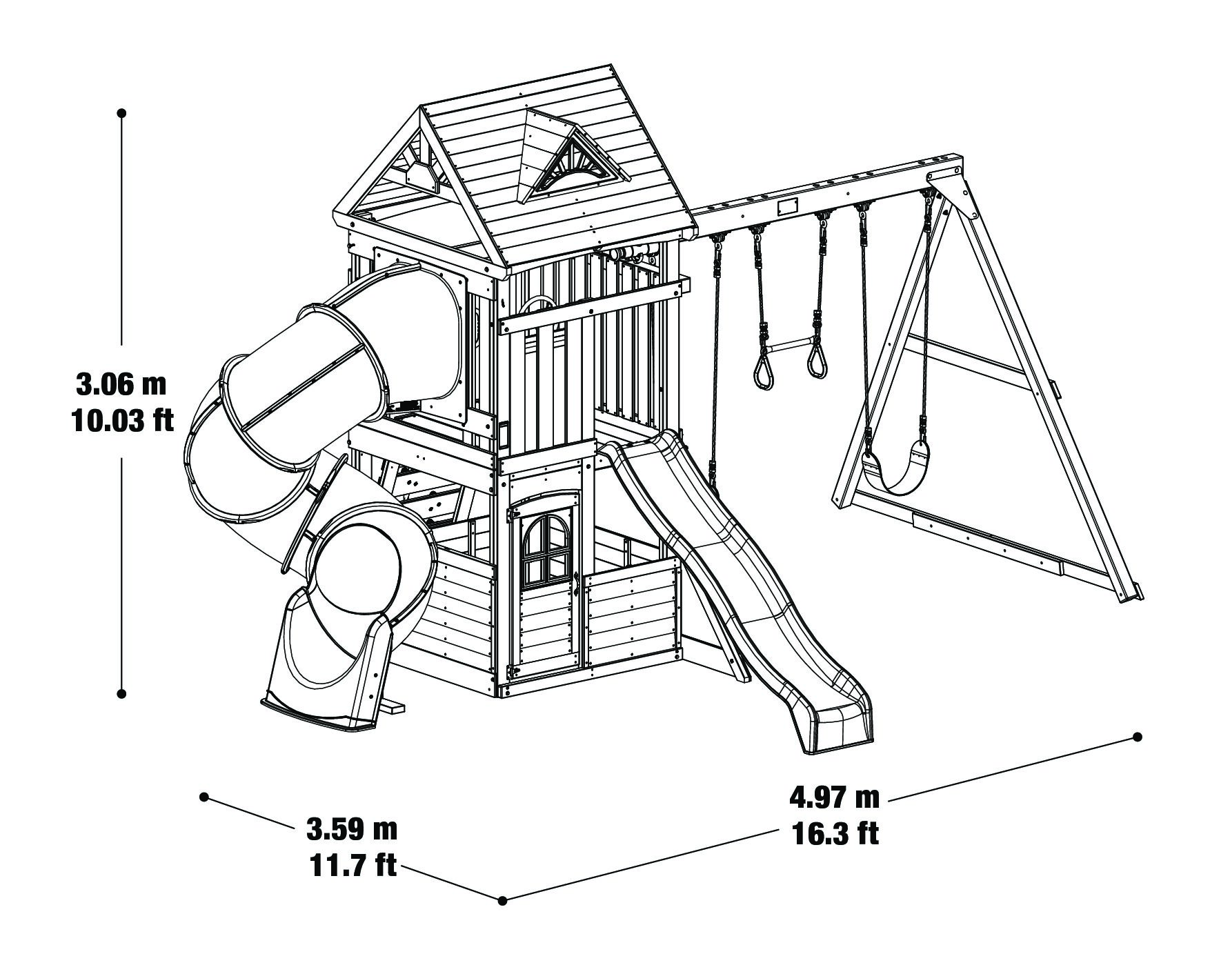- Overall play set dimensions: 16 ft 3 5/8 in (4.97 m) L x 11 ft 9 3/8 in (3.59 m) W x 10 ft 1/2 in (3.06 m) H